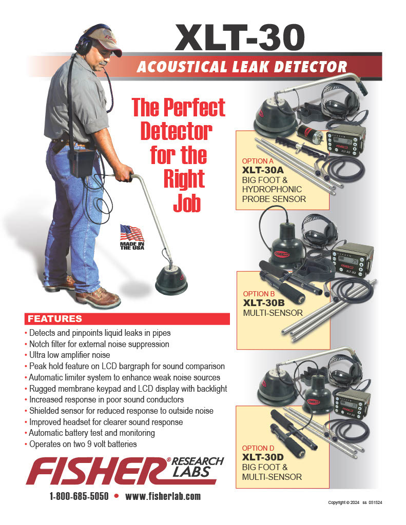 The XLT-30 takes leak detection to a new level with advanced electronic amplification and filtering. An all tactile keypad along with an easy to read digital display enables even the novice to become proficient at leak detection. The advanced microprocessor enables ENHANCEMENT of the weakest sounds like those in non-metallic pipes or those in sound muffling conditions. The XLT-30 is also designed to reject most loud interfering noises like wind, motors, and traffic.