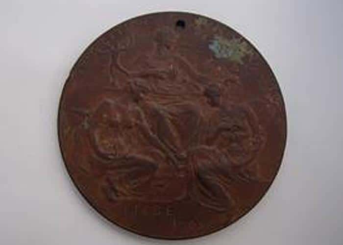 <p>After getting all the dirt off at home there was more writing on the object, EXPOSITION UNIVERSELLE, LIEGE 1905. I did a lot of internet research and with the help of Jack Daniels Company they helped me identify the object as a Bronze medal prize from the 1905 Worlds Fair in Liege, Belgium.</p>