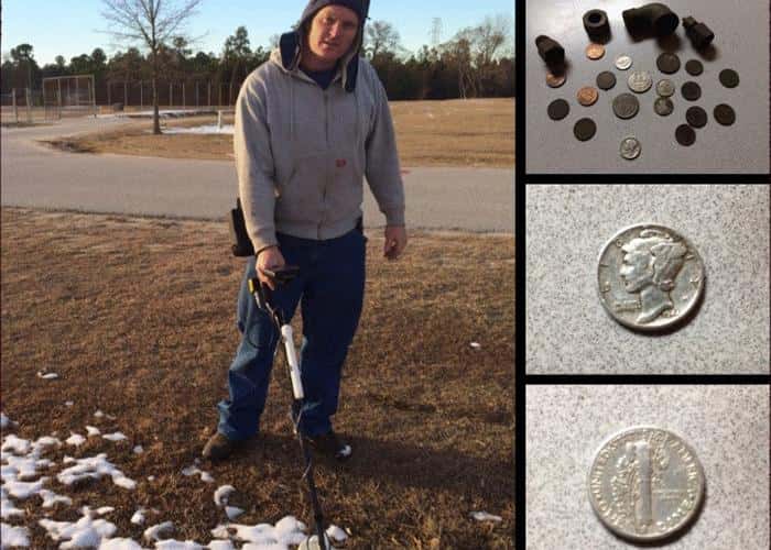<p><strong>I recently took a friend, who has been asking about metal detecting, hunting a couple of days after we had snow.</strong> He knew nothing about metal detectors except they find metal in the ground. So, I took him and my White’s V3i out to a large high school football stadium parking lot for a little training. I knew this would be a good place to find an assortment of targets with varied conductivity. After taking him through a tour of the menus and programs, I showed him how to move the coil across the ground with a good sweep speed. I showed him the VDI and Target ID by placing a few planted coins in the ground so that he could see how they come up on the V3i display. We moved from the test area out into the hunting ground, where I turned him loose with the White’s V3i. We recovered pull tabs, bottle caps, foil, and other trashy items along with many clad coins. He asked why can’t we just pass up the trash so that we can just get the good stuff. I explained discrimination and how we could set up the V3i to notch out or discriminate certain trash out, but we reduce our chances of finding some really good stuff like gold rings or other jewelry items. I explained that within the trash there can be the treasure. Let’s just say that what happens next proves this point completely. We continued on and he hits a target that sounds like a clad quarter going one way with the coil sweep and a bottle cap going the other way with the coil sweep. I asked him what he though the item was before we started digging. He said it might be 2 different targets because there where 2 different target signals. I felt sure that we were going to find a clad quarter and maybe a bottle cap. Well, I was partially correct. I dug the plug and we started looking for the targets. The bottle screw cap came up first. My friend told me that the White’s V3i machine was right about one target but how about the other. We continued to look for what I thought to be a clad quarter but came out to be a 1944 silver Mercury Dime. WOW!!! What a great find I told him. He was so happy. He couldn’t believe that he found a silver coin the first time out metal detecting. He said the White’s V3i is an amazing detector that can give even a novice the power to find awesome targets with just turning on the machine and going. He told me next that he is sold on metal detecting, and he is sold on White’s Metal detectors. White’s, another customer is coming your way. Thanks for making machines that are easy to use for beginners and for the advanced users. It was a joy to see the same excitement and happiness in his face that I enjoy when I make those treasure finds too. It looks like I have a new hunting buddy. </p>