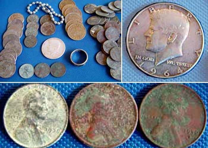 During my hunt I began to notice that some of the coins I was digging up were pre-82 pennys, 1965 quarter, 1953 nickel and 1965 and 1966 dimes. I had been hunting pretty fast, but after seeing the dates on these coins I slowed down. I had just recovered 3 pre-82 pennies and before moving on I swung my coil over the hole and got another good signal. I dug down further into the hole, to about 4 inches, and recovered three wheaties.