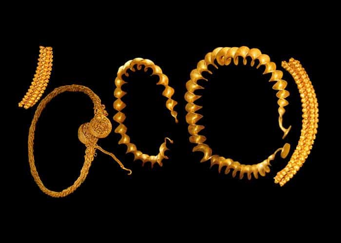 The news of David's disovery led to international interest. These four golden neck pieces, referred to as "torcs," are estimated to date 300 an 100 BC. Early speculation has been that his "Stirlingshire Hoard" could fetch more than $1.5 million!