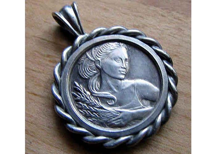 <p>I dug a small plug, retrieved what appeared to be a dirt covered 50 cent piece and continued on our walk. As soon as we returned home we cleaned what we thought would be a coin and found out that it was a large medallion from a necklace. The .925 silver medallion was a zodiac charm with the sign being Virgo. Exactly my wife's birth sign.</p>