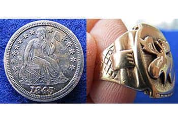 <p>With that we took our break, we came back and hit the field again and within five minutes I got a nice 12-14 signal and digging it I was hoping for an old nickel…my eyes grew big when I saw the glint of a massive gold ring! The ring has a head of a moose on it and I believe it is a Moose Lodge style ring. Just then Doug and his E-TRAC got his keeper a very nice 1883 Indian Head. All I can say is if it is there the CTX 3030 will find it!</p>