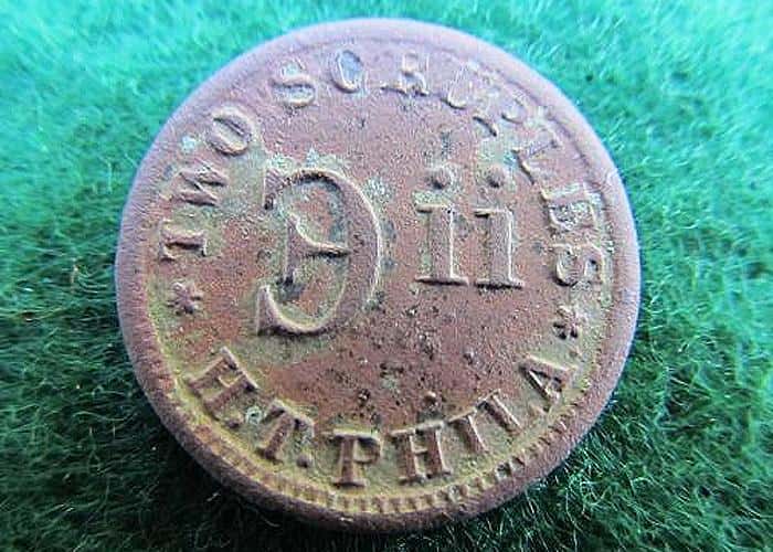 <p>Our first site was a 1900 house. Doug scored first with a 1908 Indian and I got on the board with a 1904 Indian, then Doug got 1918 wheat and then I got 1913 wheat. A bit later I dug up an unusual item, I first thought it was going to be a token or maybe a foreign coin but it turns out it is an Apothecaries weight. It says Two Scruples which turns out to be a measurement of weight; one scruple is .333 percent of a dram. These were placed on one side of the balance scale and then the medicines were placed on the other side</p>
