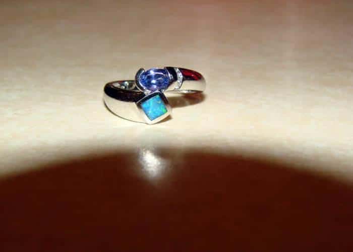 I took it to a jeweler to ID the stones. The top stone is tanzanite. The bottom stone is a black opal (I don't "get" how it is a BLACK opal, but that's what it is called. Check out that FIRE!) To the right are three tiny diamonds. And the best part: it fits me!