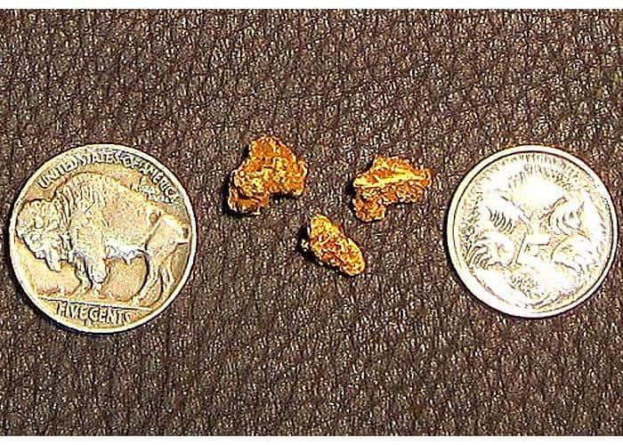 <strong>I got out and did a little more prospecting with the SDC 2300, and got 3 more nuggets, total weight 2.5 grams.</strong> The more I use this detector the happier I am with it and its finding good gold for me. I took my brother in law out with me and with the external speaker gave him a few lessons in nugget detecting. There were a bunch of old 22 caliper brass shells at this one place, and I told him we needed to get these out of the way because they would shield us from hearing any smaller targets. Sure enough, we got them out of the way, and right in the middle of where they were was a fainter target. I told him that while larger nuggets would sound like those brass shells near the surface, most gold would sound like this fainter target. We dug it and it was the smallest of the three nuggets shown in the photo.