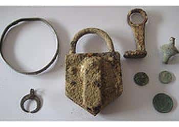 <p><strong>With metal detector X-TERRA 705 I found these old objects.</strong> They are from 3rd century (ROM-EMPIRE) 3 coins, 1 silver bracelet, 1 old key, 1 old padlock. The big coin is from Gaius Aurelius Valerius Diocletianus, was a roman emperor from 284 to 305.All items where find at one location.</p>