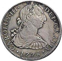 Here are the specs from ncgcoin.com:SpecificationsComposition: SilverFineness: 0.9030Weight: 27.0673gASW: 0.7858ozMelt Value: $17.15 (9/29/2013)DesignObverse: Armored bust of Charles III, rightObverse Legend: CAROLUS III DEI GRATIAReverse: Crowned shield flanked by pillars with banner, normal initials and mint markReverse Legend: HISPAN ET IND REX ...