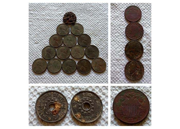 <p>I found a grand slam of nickels! 1867 Shield nickel, 1899 V nickel, 1913 Buffalo nickel, and 1948 Jefferson nickel. I also came away with 15 wheat pennies and 2 Utah tax tokens.</p>