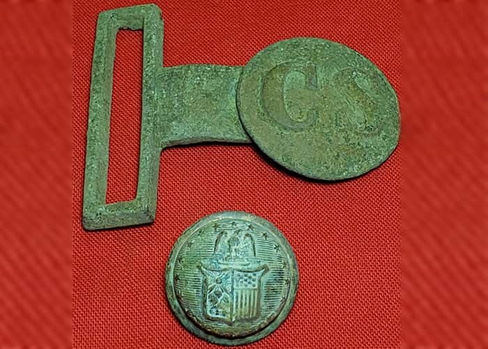 I scooped out soil with my hand from about 10-11 inches down, and caught a glimpse of beautiful green patina in the ridge of soil on the edge of the hole. It was unmistakable. Having long since committed the image of this bucket list relic to memory -- the square belt-keeper end of a Confederate States waist buckle. With my heart pounding on high octane, I gently brushed off the soil and revealed the find of my detecting lifetime, a perfect CS buckle tongue! What a way to end the day!