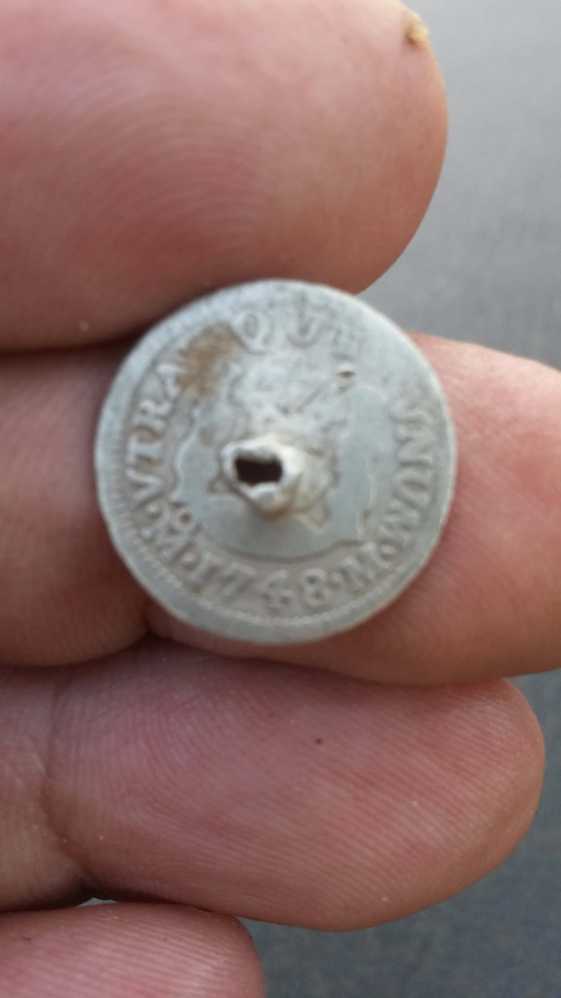 My father, Buzz Verneau and I have both bought AT Pros from Kellyco and were excited to try them out. We were lucky enough to get permission to hunt an area in middle Georgia that was a Civil War camp site on Sherman’s march to the sea. We had vision of three ringers and belt buckles dancing in our heads. Unfortunately, none of that came to pass, but to hours into the hunt I was surprised at what popped out of a shallow 2 inch plug. It was a holed 1748 half Reale with an “oM” mint mark (Mexico City). I could not believe my eyes. So thankful that my Dad was with me. Making memories.
