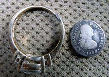 <p>When I arrived I set the Safari up to my favorite settings. After detecting for about an hour and find some clad coins the Safari sang out a nice tone and showed a symbol of a ring and target Id of 10. I slowly cut out the plug and saw a glimmer of gold. I reached down and carefully pulled out a big gold ring. The ring had a huge stone and was very dirty. It was heavy and what did shine was bright I knew it was real. </p>