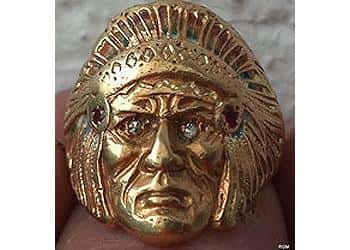 <p>What a thrill it was when I saw a glint of gold sparkling in the 4 inch plug! It was an 16.7 gram 18K solid gold Indian Chief man's ring with diamond eyes and rubies on the headdress!!!</p>