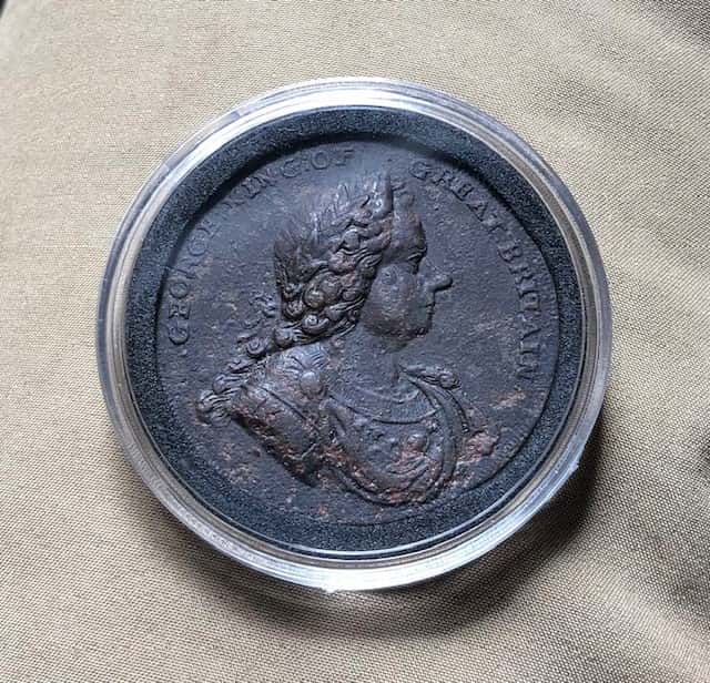 Sunday 02/28/2021 I went detecting with a couple of friends, we had hit a site earlier and did not find much, so try an area we have been to a lot and just about hunted out, but there is still some things there but it has just got to be your day to find something. Had a couple of targets but pulled regular old brass shot gun shells and buck shot. I am using my old trusty Nautilus DMC-IIB, love that machine, had fallen tree where the roots were pulled out the ground, so like always check where it pulled out the ground. nothing there, making my way back to my friends as they are moving off from me. Got a signal, well thought to my self after just digging three shot gun shells, that it might be another. dug it and so a copper disc, of course I am getting excited, I start yelling my friends names, trying to get them to come back as none of us have found anything up to this point. but seeing the disc, I knew it could be a large button or a large copper coin. The sight has been known to find some King George coppers out of there and tomback buttons. Still not seeing my friends, I started getting dirt off the item. I saw a head facing right. If you know about KG coppers some face left and some face right, this one is facing right. on the face of coin it read: George King of Great Britain. So I am calling my friends on my cell phone, you need to get back to me quick, I have got a KG copper. My friend said I will be there in a minute to help you ID it. He has found some before, most of mine of clipped, so not whole coins, but this one is whole. I clean the back a little, and I saw no date but one the back instead of what you normally see on a KG copper, I had a figure with a drawed bow and arrow and a deer with a tree and shrub. So my friends came back to where I was, I was jumping up and down and my friend said “I know that smile”. He looked it and said I have never seen one of these before. So he posted on his facebook to get some help. So we detected more in that area and worked it a little need to go back. but did get a cannon shell fragment and I found 2 musket percussion caps in one hole and 5 ft away my friend dug one also. but it was getting late and park was closing so had to leave. One of my friend that was not with us, posted on Dan's facebook page, a link so we click on it and it turns out that this is King George I Indian Peace Trade Medal. It was made between 1714 and doing research on the item some have been found from MI to VA, but none no further south that Virginia. and they were giving to the 6 main tribes which there were Indian tribes in this area, but were all driven out by 1808 according to history books. As far as I know there is not a number on how many were made, but ANS Digital Library Medal in America, there were 19 looked at. There are some in museums, and some rare collections. My oldest piece to this was a 1748 Spanish Reale, but this goes back further for me. Still have not made to 1600's yet, but still looking. What makes this piece so special for this area. There was a settlement around 1660’s called Charles Towne, and then next town was settled in that area was Brunswick Town in 1720’s. The county at the time was called Bath County, but was renamed later Brunswick County, and county beside it was called New Hanover County. Well King George I was king from 1714 to 1727 and he was Duke of Brunswick and Earl of Hanover, which this area was named from him. You had the Tuscarora Indian wars going on 1711-1712 in eastern North Carolina. This peace medal was given to the Tuscarora Chief at the time and then Yamassee Wars started in 1715. So the question is was the medal lost from breaking or did the chief deposed of because the peace treaty was broken. Either way on the banks of Old Town Creek in Brunswick County, NC on Feb 28,2021 I dug up a piece of history 307 years old. No one knows how many of these medals were made, and all of the one found have been found around PA and NY, this is the only one I know of in doing research that has been found in North Carolina. It just one of those finds, that every time I look at it, I still cannot believe that I found it. And just holding a piece in my hand that has so much history tied to it. So far to date there has been 6 different varieties of this medal this one is Obverse III Reverse F. I have been metal detecting over 25 years and I would have to say this is my best find ever. I have been contacted by the Tuscarora Tribe and they want to hold the medal again after 307 years. And my plans are to keep in on display at the Brunswick Town museum where they have a Cape Fear Indian display. On the pictures attached on pictures with medal in hand is the day I pulled out of ground, second set of pictures is after I cleaned it up and put in case. Then I had medal sent off the NGC to be preserved and to be graded.