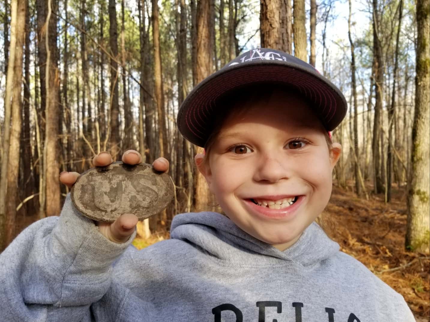Emily Copeland, aka "Little Dirt Digger" who is seven-years-old, was hunting a Civil War encampment in the woods near Adairsville, Georgia when she found her first US box plate.