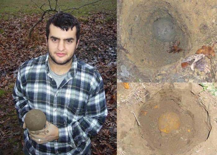 Right after I hit the clay I started to see something but the coloration of the clay made it look funny. But amazingly it started to take a nice round shape again! I had dug my second cannonball in 6 weeks. Both being 12lb solid shots. The latest one even has a mold seam on it which makes it undeniably confederate. The M6 and MXT are two great relic machines and I'm looking forward to years of fun with them. Included are pictures of the both balls still in the hole and a picture of me holding the second one.