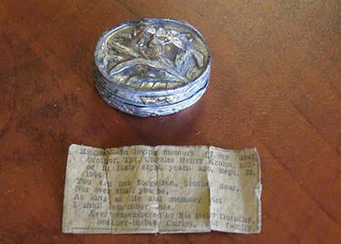 <p>After finding a couple of 40's silver coins I got a solid silver reading at 6 inches down. To my surprise out popped this little silver case. Brought it home and cleaned it up a bit called the wife over to the kitchen sink and asked her to open it. Inside was a tightly folded wet newspaper clipping of a memoriam which read's:</p>