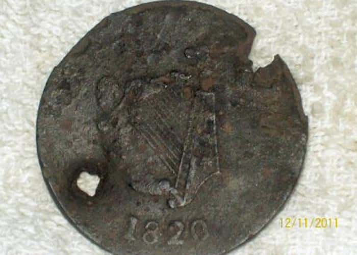 But then I got a button signal on my display and it was a fairly steady signal. I pinpointed it and it showed 8-9 inches, so I dug my plug and saw a round disc. At first I thought another button. Don’t get me wrong, I love finding buttons, but when I looked at it closer I knew it wasn’t. I could read the date 1820. I said to myself “What could it be?”