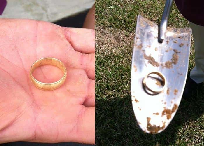Of course he had all his kids and wife out to see if I could keep my end of the bargain up. It was a good spot to hunt with no ground clutter. I'd rather be lucky than good and in about 13 minutes I hit a strong +35 and told him his ring was right there. He thought I was crazy and I handed him my digger and told him to dig it because I didn't want to scratch it. He had a grin from ear to ear when he pulled his ring out of the plug. His wife couldn't believe it. It was great to see my friend and his wife get something that they treasured back after thinking it was gone forever.