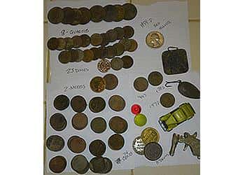 <p>The E-TRAC was able to distinguish between those signals and "show" me the wheat. Amazing!! OK, on to today's hunt. I went back to the neighborhood that I found my last merc, and continued to work the sidewalk strips. As you can see I had an over 100 clad coin day, a few wheats, and my first silver quarter!!! I also found the interesting "tag" with the woman's face on it. I have no idea what it is. I can't wait to get after it again. HH</p>