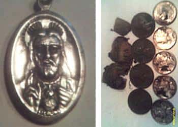 <p><strong>Saturday June 9 2012, I had to work today so I got out for a short hunt after work.</strong> It was hot and I wanted to stay in a shady area. I was a hunting a place I have never hunted before. I dug the usual trash and clad coins. I also dug two wheat cents and King George penny. Then a large sterling religious medal with Jesus on one side and Virgin Mary and Baby Jesus on the other.</p>