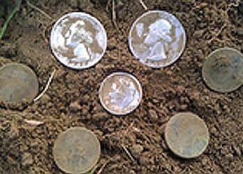 <p>After hunting around and finding a few odd relics I concentrated my search closer to the old farmhouse. The E-TRAC started giving me signals indicating dime and quarter size targets. I dug down about 6" and was rewarded with a pocket spill of two Silver quarters 1942 and 1950 also a 1954 Roosevelt Silver dime and four Wheat Pennies. Not too bad for a quick hunt after work!</p>