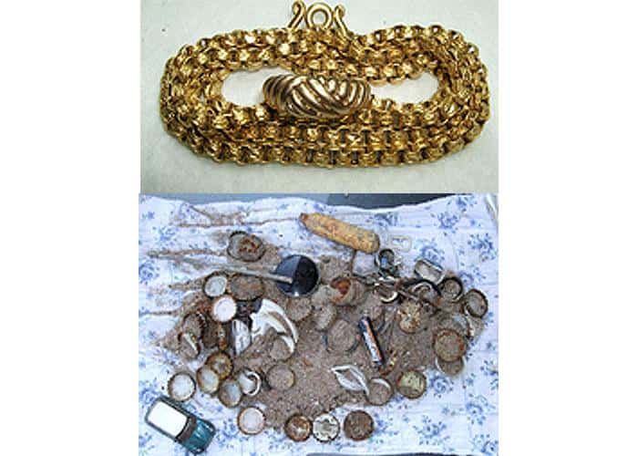 <p>I was pretty pumped by this, but in the next few swings and not two feet away the E-TRAC rang out again. A few seconds later, I was staring down at a shiny necklace in the middle of my sand scoop. At first I figured it was costume jewelry as I couldn’t find a stamp or maker’s mark on it. Then I started thinking that all of the other metal I’d pulled out of the sand (other than the 14k ring) had been pretty corroded. Also, as I was shaking the sand off it, I started thinking, “This is kind of heavy, could it really be gold?"</p>