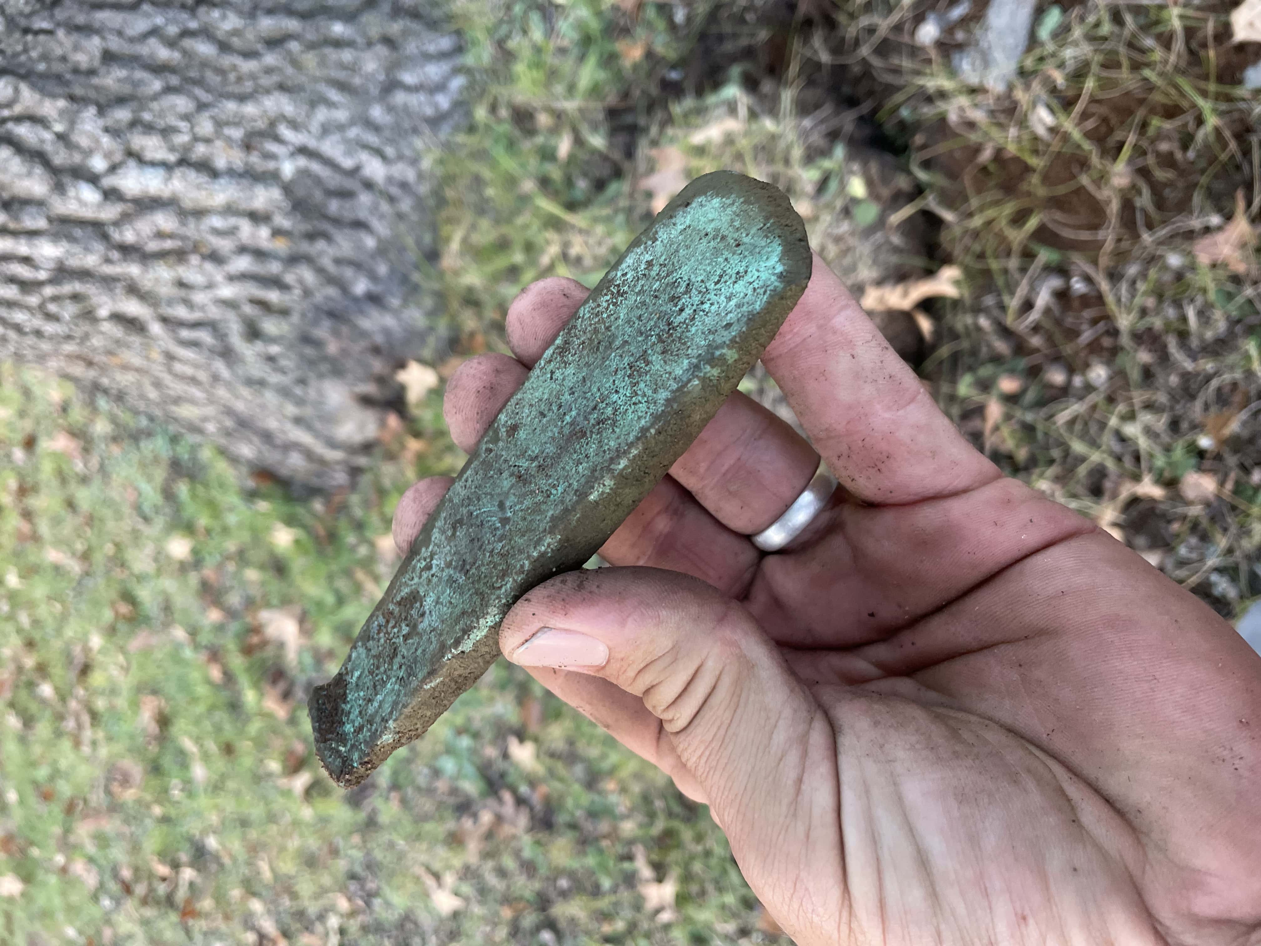 I turned my attention to the large maple trees that looked to be at least 100 years old. I found a set of keys, more pull tabs, and miscellaneous hardware. I was feeling discouraged, but it was too late to go anywhere else. As I was detecting back towards the car I circled the last tree, the Equinox chirped loudly with a 39 on the display. In my experience so far a 39 was some kind of large sheet metal or garbage. I hoped for a silver US half dollar. I cut a nice plug next to the old maple and peered down the hole. I didn't see anything so I prodded around with the pro-pointer. It was still a bit deeper. I carefully removed another 4 to 5 inches of soil and again looked down in the hole using the pro-pointer's flashlight function. I could make out something green. It wasn't a coin and wasn't the sheet metal that I expected. As I gently retrieved the unknown item, I asked myself what is this thick heavy piece of copper doing here. My wife Sarah asked what I was finding and I told her she just some kind of old copper. When I said old copper I thought of the old copper culture native Americans that once lived in our area. So I gently brushed off the rest of the loose dirt and discovered I was holding a 7000 year old native American copper artifact. I'm so happy with this find. Never give up on a spot until you have covered everything is what I learned.
