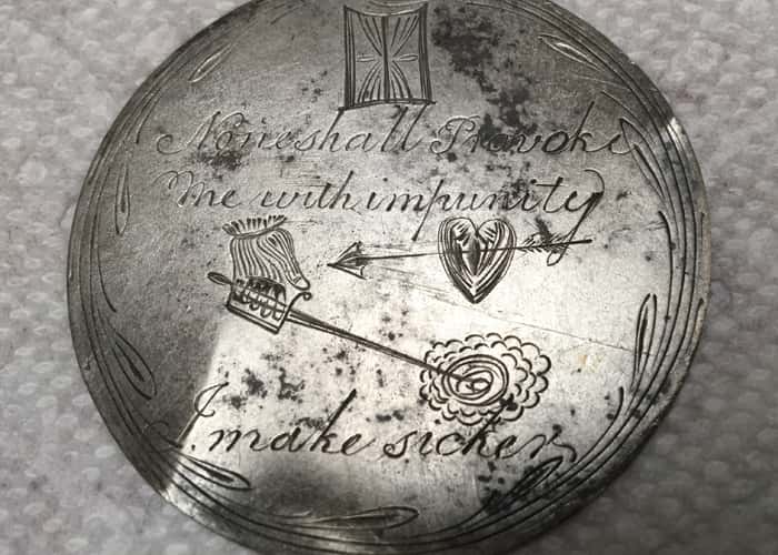 What I have is a thin flat silver disc about 2 inches across. It is heavily engraved with Scottish iconic symbols. There is a lion, thistle, heather, an hourglass, an arrow through a heart and a hand holding a sword stabbing a rose. ( I learned that signifies “ striking at England “ symbolized by a rose). (This actually looks like a metal detector!)
