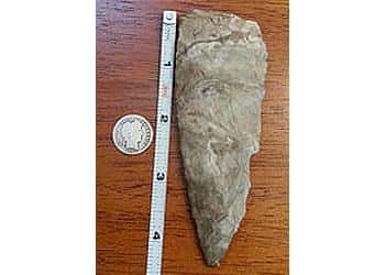 <p>The stone spear point is called a Cobb's blade. It is from the Archaic period and dated back 10,000 years. Amazing what you might find in the same hole with a coin.</p>