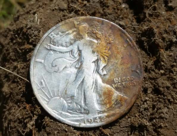 I was at the very base of a ten-foot, underbrush-covered rise that separates the park from a golf course when my AT Pro hit on a mid-80s target. Figuring it was a quarter, I started digging, and about six inches deep I saw the edge of a large coin...and extracted my first walking Liberty half-dollar. In addition, also in the hole was a 1960 Roosevelt dime and a 1942 Jefferson nickel. Quite a haul for a 3-year detectorist!