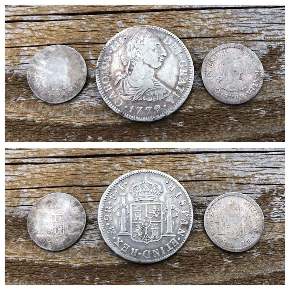 Eager to return to the site, I went back on March 26th for a necessary recap. I knew exactly where I had dug the 2 reale as the ground still appeared disturbed, and I had taken photos of the area the last time I was there so that I would easily find my way back. I decided to swing over my original plug and to my surprise, I got a solid 22 signal on the Equinox which turned out to be a 1773 half reale. At that moment, my heart nearly stopped as I realized that A) I had made a huge mistake by not rechecking the hole in my excitement the first time, and B) I had a spill that most of us only dream of. To be sure I didn’t make the same mistake twice, I swung over the hole again and got another 22 signal - in about 10 seconds, I had a 1789 half-reale in my hand. That was the moment I knew I had not only an incredible spill but that it was the find of a lifetime!
