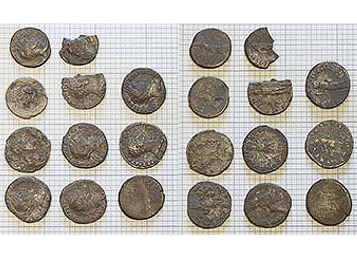 <p>I find that talking to farmers can give a lot of useful info, as it is their land and know more about it than any map can show. The broken ones are most likely been damaged by a grass topper rather than by ploughing. The hoard was most likely hidden sometime in the early 2nd century as the earliest one is a Mark Anthony and the latest a Hadrian. The majority of them are Vespasian's.</p>