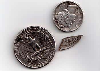 <p>The next hit was jumping slightly but still in the penny dime range and showing about 6 inches but pin pointing rather small but I decided to dig anyway and retrieved the sliver of a silver quarter shown in the picture. WOW 6 inches on that tiny piece and the V3I still was telling me a probable coin!</p>