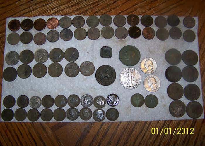 <p>We tag teamed while one found and opened the hole the other would find the coins. In 2.5 hours before a snow storm on the first of January we found 30 pennies including 2 Wheaties, 11 nickels, 18 dimes, 10 quarters including 2 silver quarters, 1 walking liberty half dollar and the odd ball 1938 British one penny.</p>