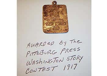 <p>Way back in 1917, a young boy, or girl, sent into the Pittsburg Press (notice no H as yet) a story about George Washington (a contest), and was given this medallion as a prize award. I was hoping to trace this back thru the paper, to a person, but they can't seem to find it in their archives. I do however know that this award has not been lost by someone. It has been just been tucked away, for these past 94 years, waiting for a detectionist ( with an E-TRAC of course) like myself to come along. I absolutely consider this as my very best find to date.</p>