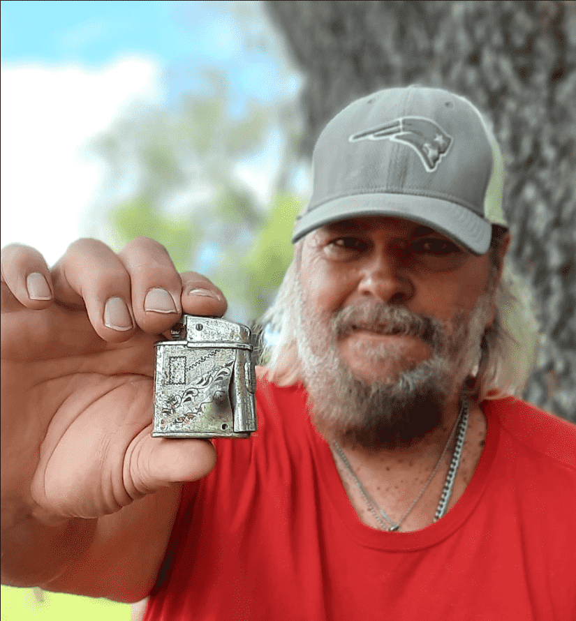 Billy Keen of Pinellas Park, Florida was working an old railroad yard in early October with his Equinox 800. After receiving a deep intermittent signal he dug up this early 1900's pocket lighter with an unusual bulge on one side of it. When he looked it over he saw what appeared to be a bullet entrance on the reverse. When Billy took it home and flushed the dirt out, he confirmed that the bullet was rattling around inside the lighter. A crazy find that begs the question, who shot the lighter and why?